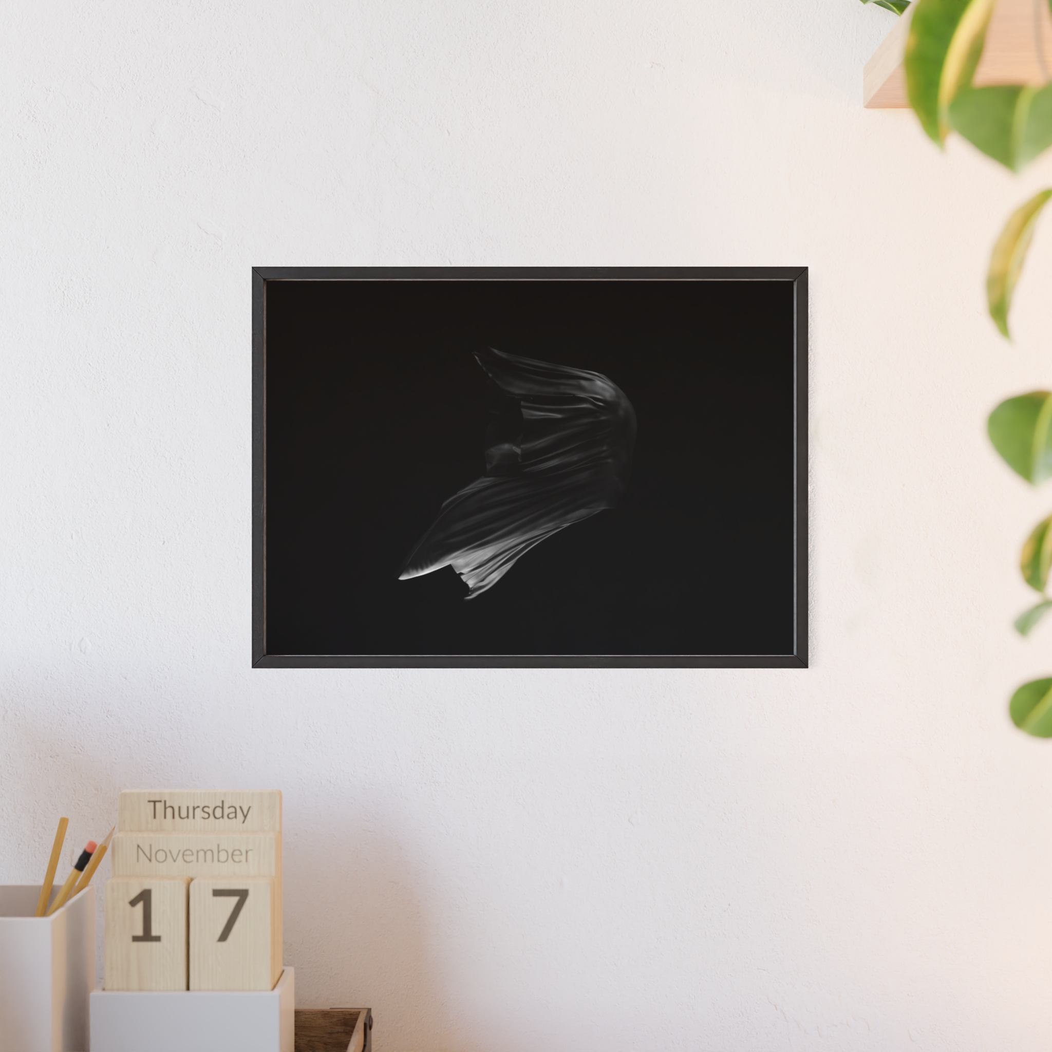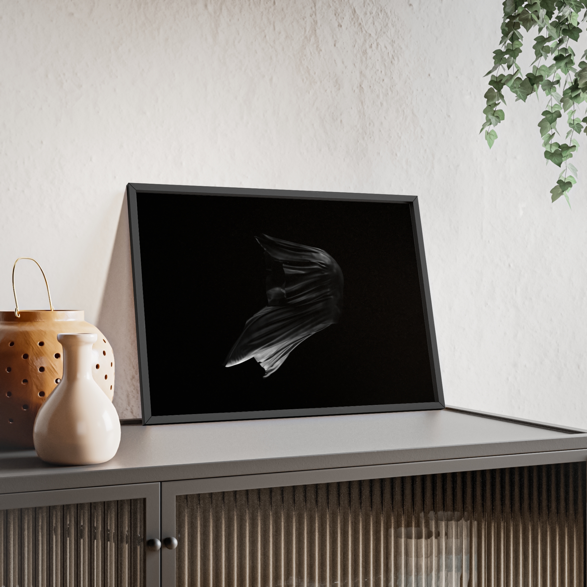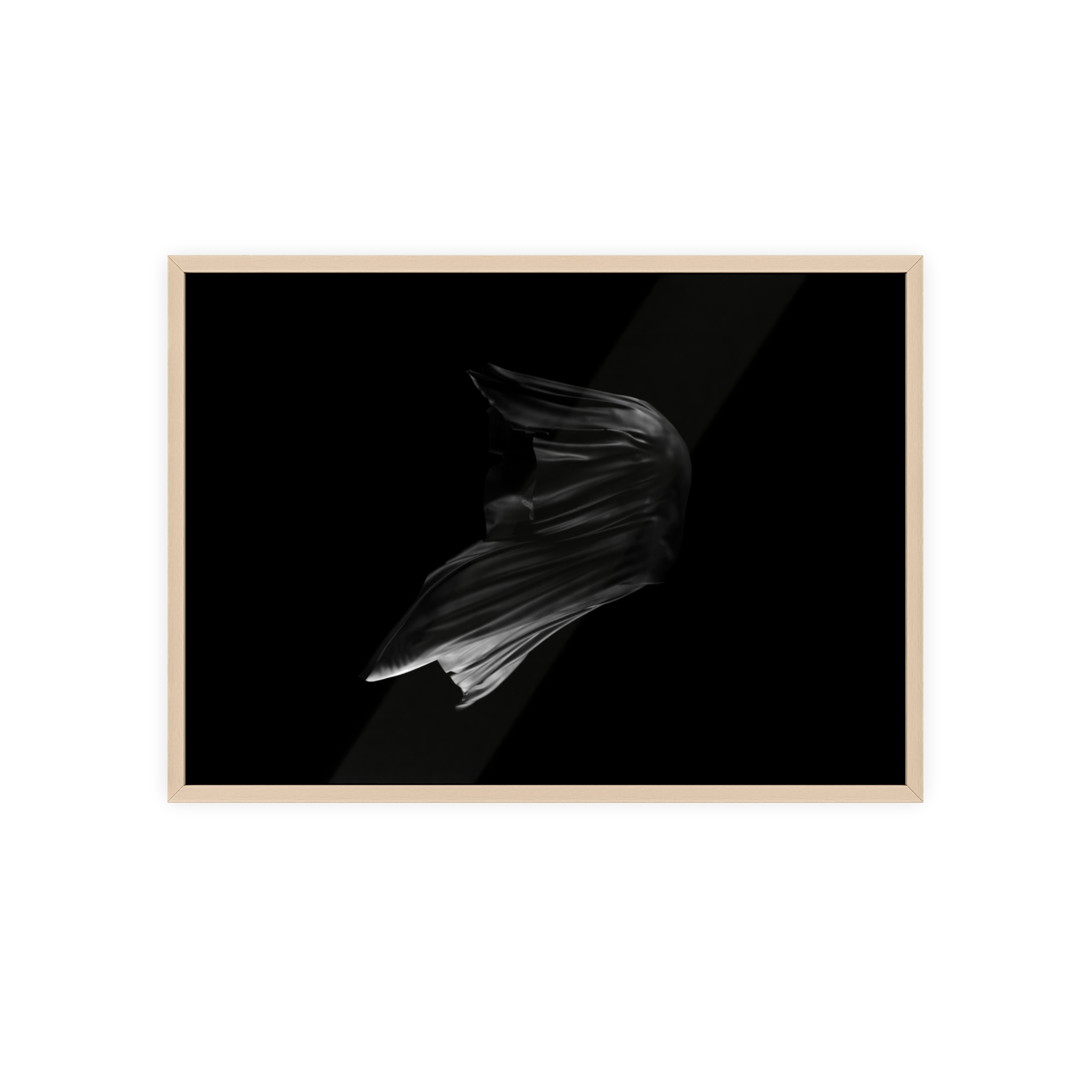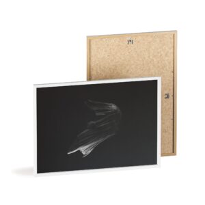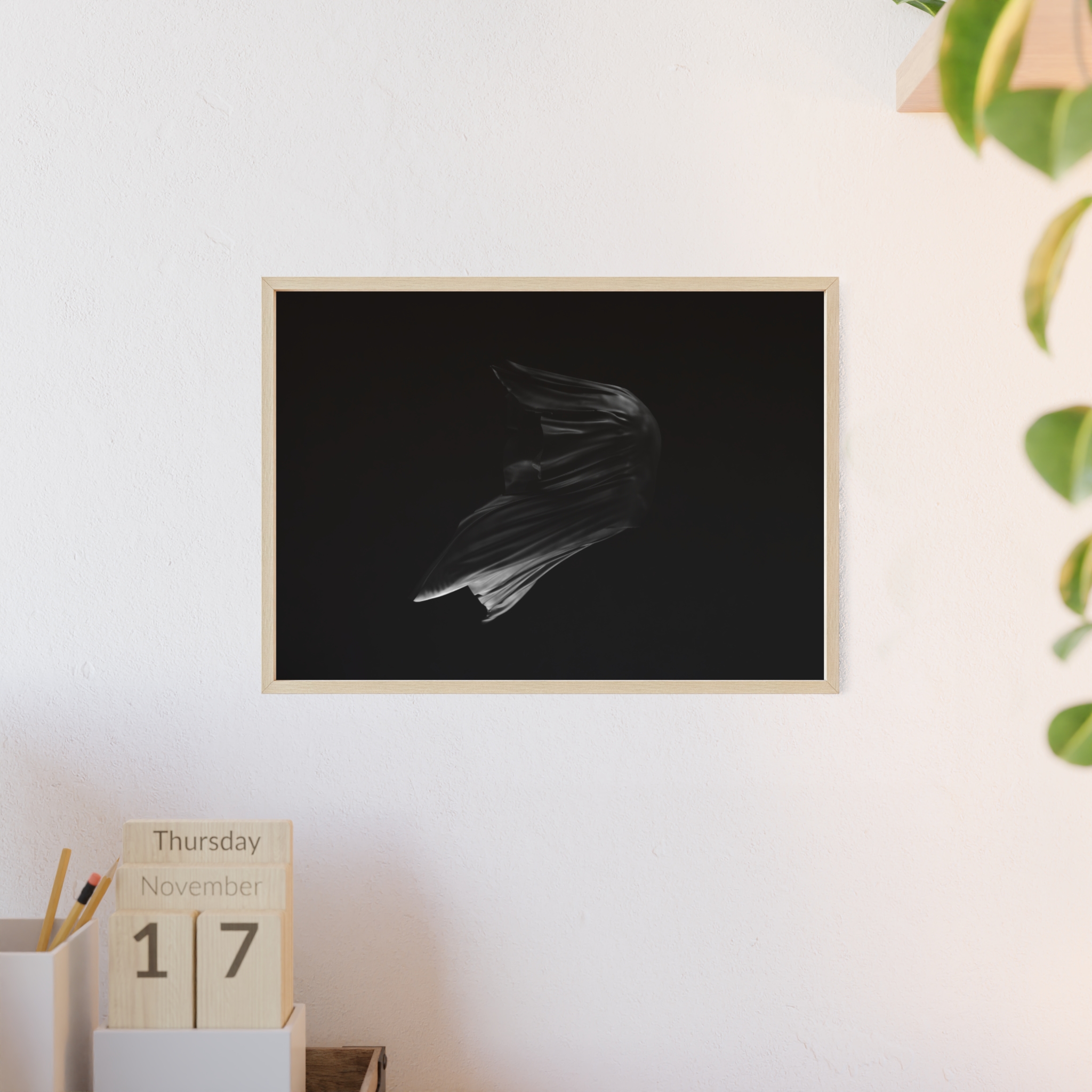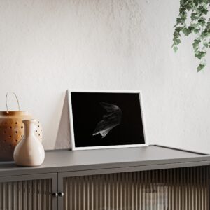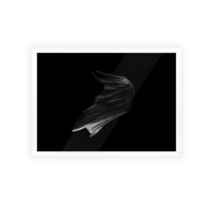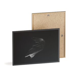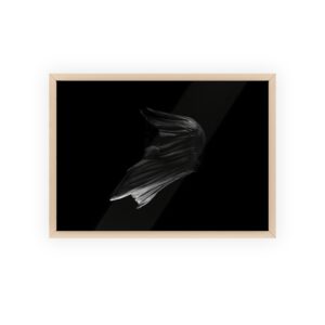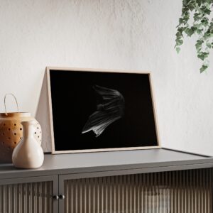 A minimal, framed poster that brings calm and quiet sophistication to any wall. The deep black background makes the soft, flowing brush-stroke the focal point — like a frozen whisper in motion. Choose a Natural Wood, Black, or White pine frame to match your room’s mood, and pick Satin or Matte paper to control the sheen. It arrives ready to hang with protective acrylic glass and hardware, so you can place it in a living room gallery, a serene office corner, or above a bedside table for a subtle statement of taste and restraint.