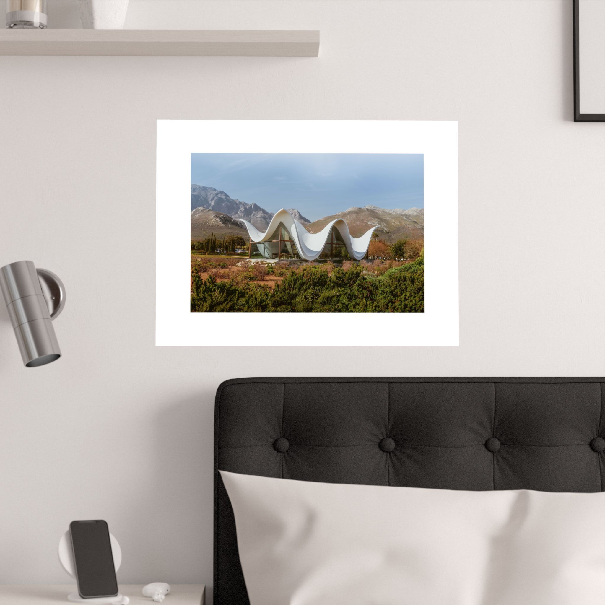This satin poster brings a quiet architectural moment into your room — a flowing white pavilion set against rugged mountains and warm scrubland. The low-glare, museum-grade paper renders crisp lines and rich pigment so the roof’s sculptural curves and the autumnal landscape read like a window to another place. It hangs easily in horizontal, vertical, or square arrangements and sits beautifully in living rooms, studios, or reading nooks where thoughtful design and calm views matter. For collectors of modern architecture and lovers of desert palettes, this print adds a serene focal point that feels both refined and lived-in.